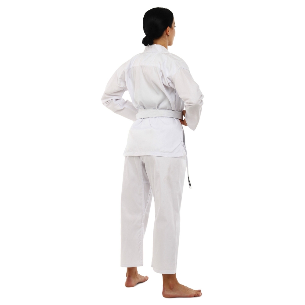 Комплект кімоно складається з трьох елементів: куртки-кімоно, штанів та пояса. Куртка має традиційний крій та довгі рукави, що забезпечують свободу рухів та комфорт під час виконання різних технік карате. Штани оснащені еластичним поясом для надійної посадки на талії, що сприяє зручності та впевненості у кожному русі.